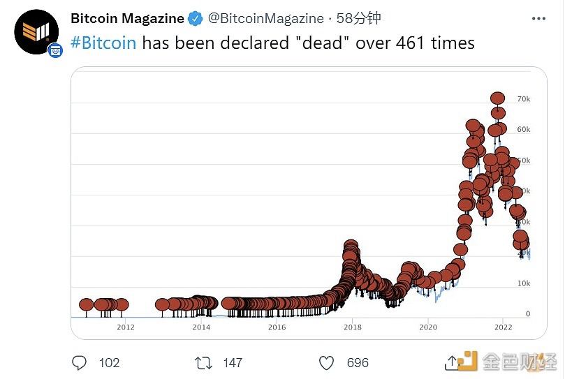 : Bitcoin Magazine发推称,比特币被宣布“死亡”超过461次。