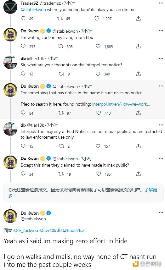 摘要: 对于“国际刑警组织已向 Terra 创始人 Do Kwon 发出红色通缉令”的报道,Terra 联合创始人 Do Kwon 在推特上表示,有人可能在“过去几周”中看到他在街上或购物中心周围散步,他没有在国际刑警组织的“寻找并临时逮 ...