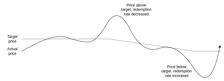 另一个需要理解的主要机制是赎回率调整。在 RAI 中,目标不是固定数量的美元;相反,它会向上或向下移动,并且向上或向下移动的速率会根据市场情况进行调整:
