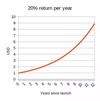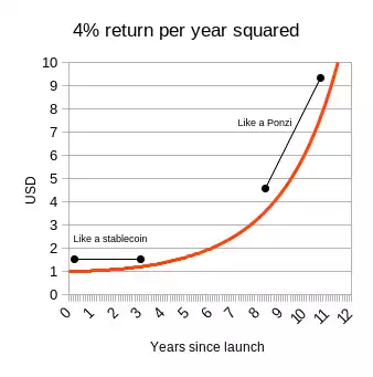 我们可以用一个评估可持续性的思想实验,来思考一下具有特定指数的稳定币:如果美元以每年 20% 的速度增长,那么从数学上来看,该指数就是 1.2^(t-t0),其中 t 是当前年份,t0 是系统发布的年份时间。另一种更有趣的指数是 1.04^1/2(t-t0)^2 USD,用该指数美元计价的稳定币一开始增长平稳,但其回报率会以每年 4% 的速度不断增加。