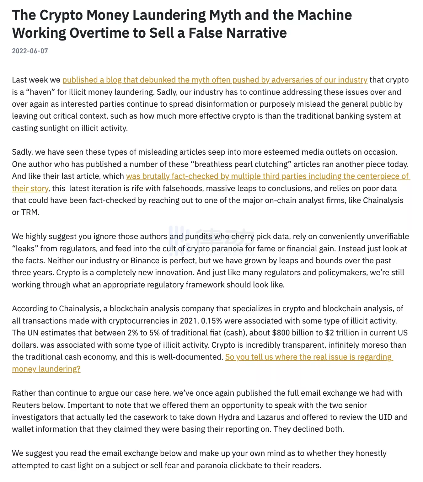 摘要:针对洗钱避风港相关言论,Binance 已经做出过诸多努力以及若干次澄清,但事件相关方仍在传播虚假信息误导公众,在抹黑加密的同时,对传统现金经济洗钱活动更为严重的事实闭口不提。针对近期路透社发布的「Binance 近 5 年来为 23.5 亿美元非法洗钱活动提供渠道」一文,Binance 正式做出回应,并同时将其与路透社的来往信件公之于众。Binance 表示:「针对洗钱避风港相关言论,Binance 已经做出过诸多努力以及若干次澄清,但事件相关方仍在传播虚假信息误导公众,在抹黑加密的同时,对传统现金经济洗钱活动更为严重的事实闭口不提。」 Binance 同时表示:「很遗憾,我们甚至看到许多受尊敬的媒体也在发布相关类型的文章,这些文章充满谎言,证据来源不具备可参考价值,且结论往往脱离内容。 Binance 与加密这一创新行业都并不完美,我们仍在与监管部门合作,在研究适用于加密的监管框架一事上做出努力。 根据专门从事加密和区块链分析的区块链分析公司 Chainalysis 的数据显示,在 2021 年使用加密货币进行的所有交易中,有 0.15% 与某种类型的非法活动有关。联合国估计,2% 到 5% 的传统法币(现金;约合 8000 亿到 2 万亿美元)与某种类型的非法活动有关。加密货币非常透明,比传统的现金经济更加透明,这是有据可查的。 我们已经公开了与路透社来往交涉的所有信件,我们试图与他们合作解决问题,读者可以自行判断路透社是在客观阐述,还是在试图传播恐惧以获得点击量和热度。」